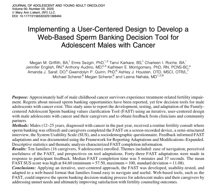 Worth the Wait Co-Founders, Mike and Megan Scherer, were honored to participate in research relating to a web based tool that helps teen boys with cancer make a decision with their family about fertility preservation. The Scherers collaborated with many well-known researchers including Dr. Leena Nahata of Nationwide Children’s Hospital, Gwendolyn Quinn, Phd, of NYU and others. An article was published about their work in the Journal of Adolescent and Young Adult Oncology in November 2026. Read the article.